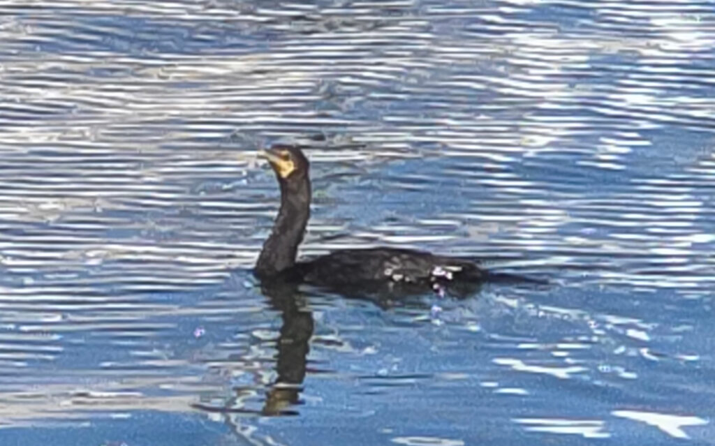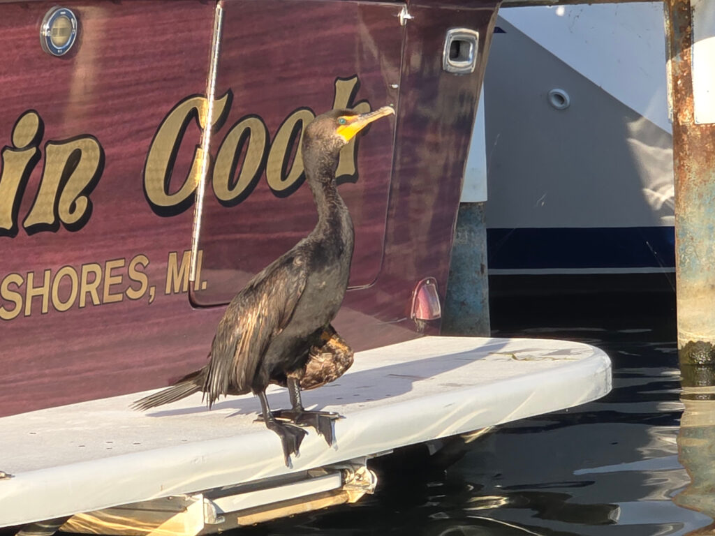 Come to find out (using google image search) this is a “Double-crested Cormorant”. A matte-black fishing bird with yellow-orange facial skin. Commonly found around fresh and salt water locations across North America. Yet, as far as I can remember, it is the first time seeing one.