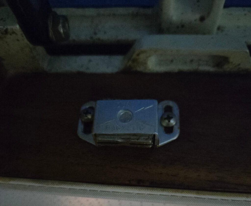 Once I got back to the boat, I removed the motor and battery, secured the dinghy and reviewed other work that could be done. But with a potential storm rolling in and running out of daylight, I decided to head home. I took a picture of the magnets on the forward hatch that I have been trying to get a screen solution working for. (I manufactured a screen but come to find out that the screen frame is aluminum and not steel). I need to find some small steel plates to glue or double sided tape to the screen so it would catch the magnets. The other problem is whether or not the magnets are even any good. But I have replacements and I will probably use the metal pieces out of those and then just either hold the magnets as spares or get rid of them.