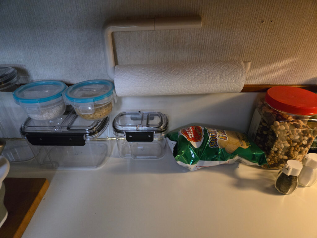 Also took a picture of the one bolt mount on the stbd hatch I have been trying to fix for awhile to remind myself and a picture of the counter so I don’t forget that I have rice (white and yellow) already on the boat to use.